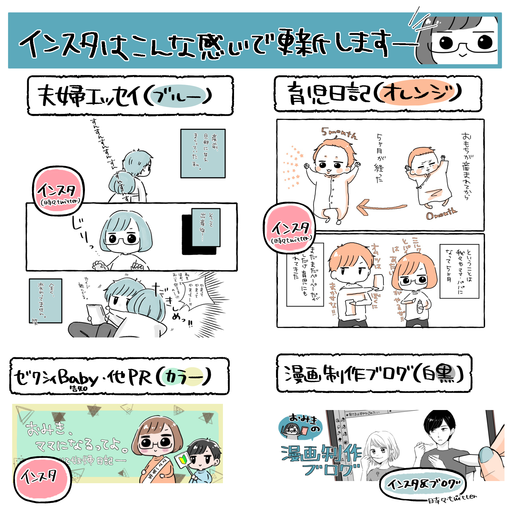 夫婦エッセイ、育児日記→私自身の体験したエッセイ漫画。