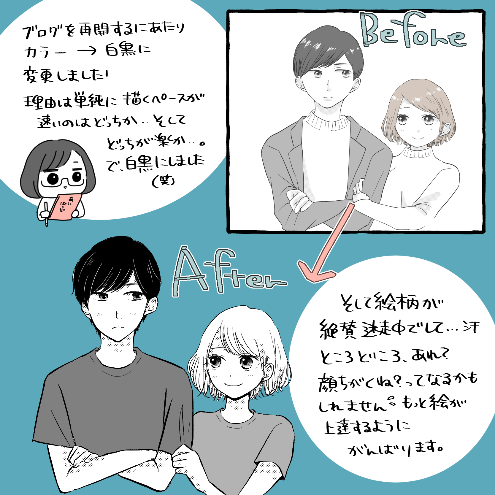 そして漫画サイズを漫画原稿用紙サイズにするか、インスタサイズの正方形にするか描いては直し、描いては直し…になってしまい、ブログでは途中まで漫画原稿用紙サイズ。途中から正方形サイズ…になり、少し読みにくいかもしれませんが、ご承知くださいませ(>_<)