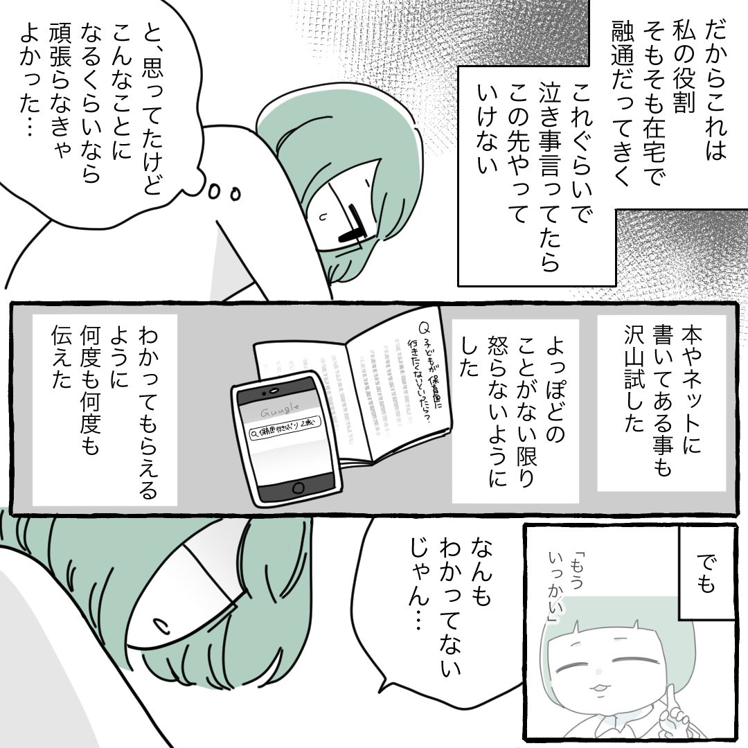 旦那がやってくれてるから、じゃあ、私の役割は私がやらなきゃって思ってたけど、この時普通に「いやいやいやー!そうは言うけどさ!やってみ!マジで大変なのよ!というか私のメンタル安定の為、明日だけ代わって!」とか言えば良かった。